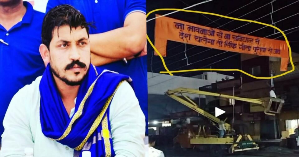 सड़क के बीचोबीच भगवा रंग के बैनर में साफ साफ लिखा है कि “न भावनाओं से न संविधान से, देश चलेगा तो सिर्फ गीता पुराण से”। सड़क के बीचोंबीच इस तरह के संविधान विरोधी पोस्टर और बैनर लगाना दुर्भाग्यपूर्ण तो है ही साथ में देश की कानून व्यवस्था के लिए भी चिंता का विषय है। इस तरह से खुले आम संविधान का विरोध करना देशद्रोह की श्रेणी में भी आ सकता है।