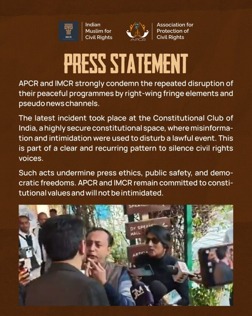 एसोसिएशन फॉर प्रोटेक्शन ऑफ सिविल राइट्स (APCR) और इंडियन मुस्लिम फॉर सिविल राइट्स (IMCR) ने अपने शांतिपूर्ण कार्यक्रमों में बार-बार की जा रही बाधाओं की कड़ी निंदा की है। दोनों संगठनों ने आरोप लगाया है कि दक्षिणपंथी कट्टर तत्वों और कुछ कथित फर्जी समाचार चैनलों द्वारा उनके कार्यक्रमों को जानबूझकर बाधित किया जा रहा है।