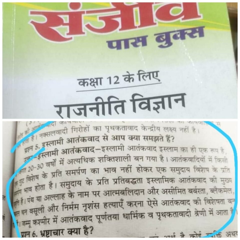 कक्षा 12 की इस किताब में एक सवाल है “इस्लामी आतंकवाद से आप क्या समझते है” जिसका जवाब भी उसी किताब में लिखा हुआ है। जिसमें इस्लाम को आतंकवाद से जोड़कर बताया गया है।