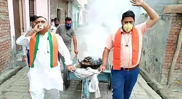 भाजपा नेता गोपाल शर्मा शंख बजाते हुए आगे आगे चल रहे हैं। उनके पीछे एक ठेले पर हवन करते हुए लोग चल रहे हैं। हवन का धुआं पूरे गली में फैल रहा है। हर थोड़ी थोड़ी देर बाद नेता जी शंख बजाते हैं और जय श्री राम के नारे भी लगा रहे हैं।