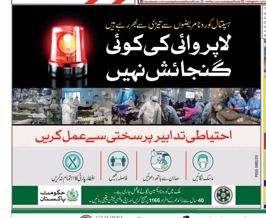 कुछ ऐसा ही पाकिस्तानी मीडिया का रवैया है। पाकिस्तान में कॉविड की दूसरी लहर से बड़ी संख्या में लोगों की मौत हो रही है लेकिन पाकिस्तानी मीडिया भारत के प्रति लगातार भ्रामक रिपोर्टिंग करके अपनी जनता को दिलासा देने की कोशिश कर रही है। पाकिस्तानी उर्दू अख़बार ‘नवा ए वक़्त’ के लाहौर एडिशन के 2 मई, 2021 के फ्रंट पेज पर ख़बर है कि रमज़ान में पड़ रहे हज़रत अली के यौमे शहादत के जुलूस पर पाबंदी लगा दी गई है और देश में 146 लोगों की कोरोना से मौत हो चुकी है। इसी अख़बार के पेज 2 पर सरकारी इश्तेहार में सरकार जनता से अपील कर रही है कि अस्पताल तेज़ी से मरीज़ों से भर रहे हैं, कोरोना से बचिए और इफ़्तार पार्टियों से बचिए।