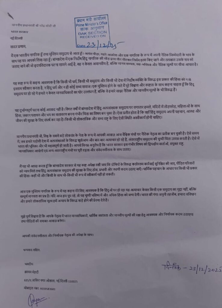 भारत के प्रधानमंत्री नरेंद्र मोदी को एक भारतीय मुस्लिम नागरिक एवं BJP नेता क़ायम मेहदी द्वारा पत्र लिखकर बांग्लादेश में हिंदू अल्पसंख्यकों के खिलाफ हो रही हिंसा और कथित अत्याचारों पर गहरी चिंता जताई गई है।
