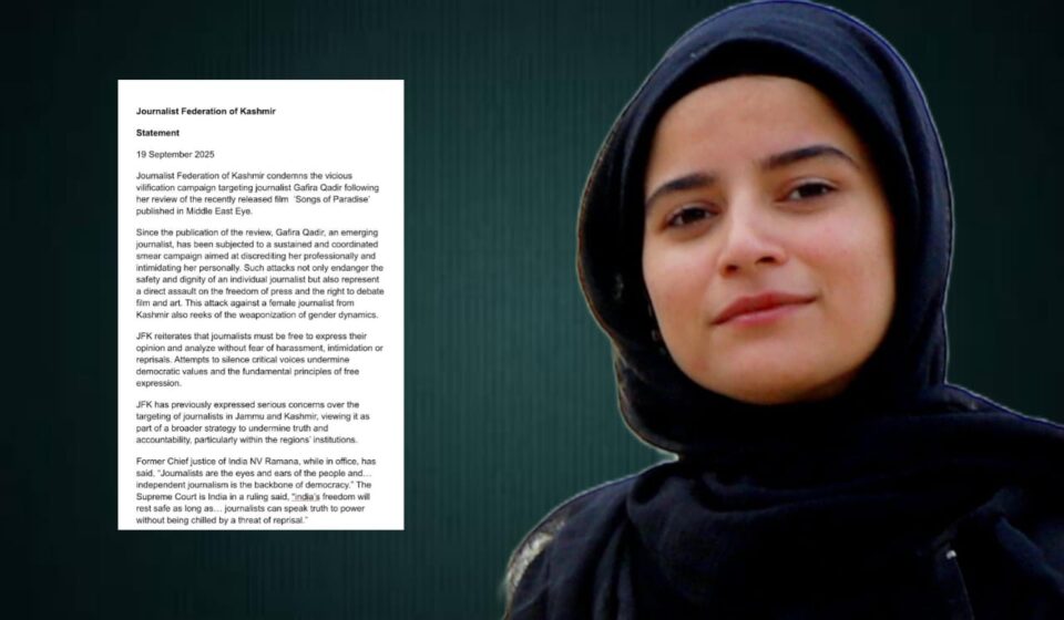 जम्मू-कश्मीर पत्रकार महासंघ (Journalist Federation of Kashmir – JFK) ने उभरती हुई पत्रकार गफीरा क़ादिर के खिलाफ चलाए जा रहे बदनाम करने वाले अभियान की कड़ी निंदा की है।